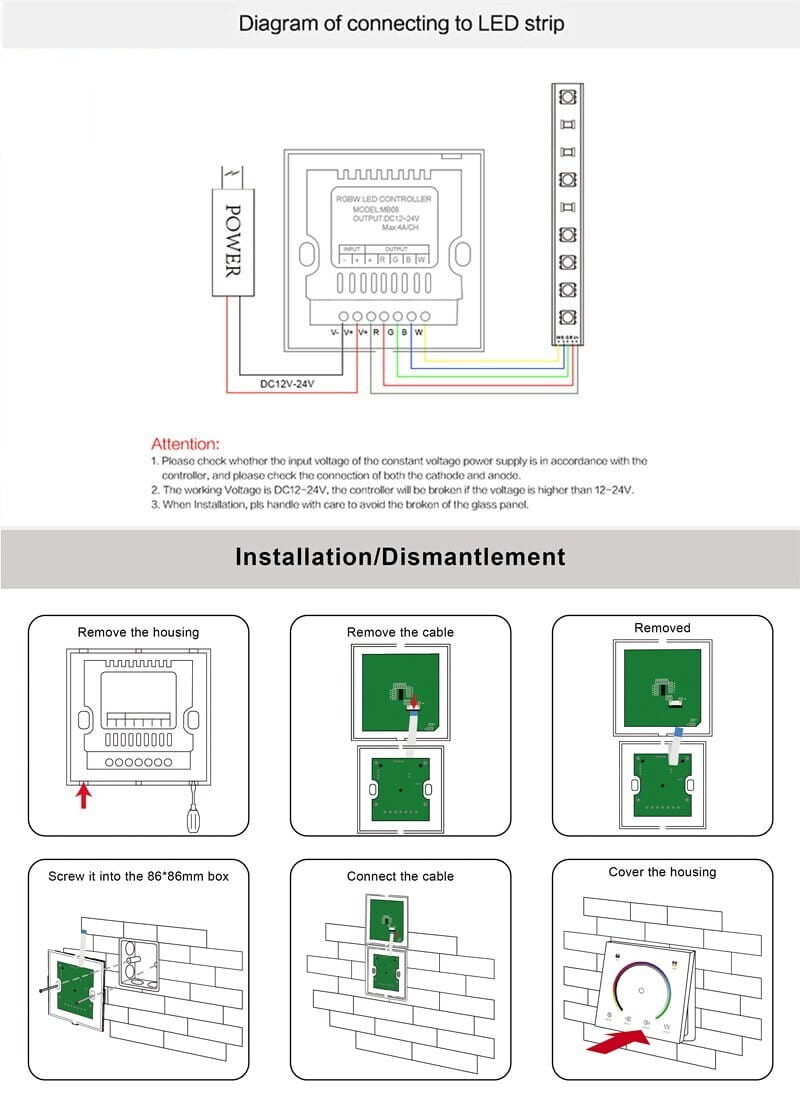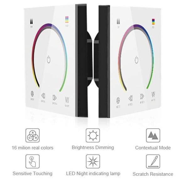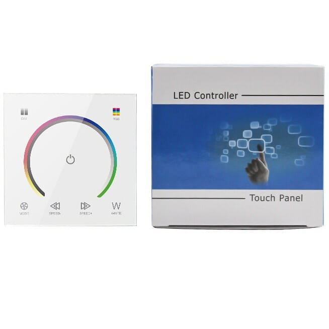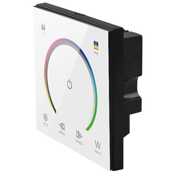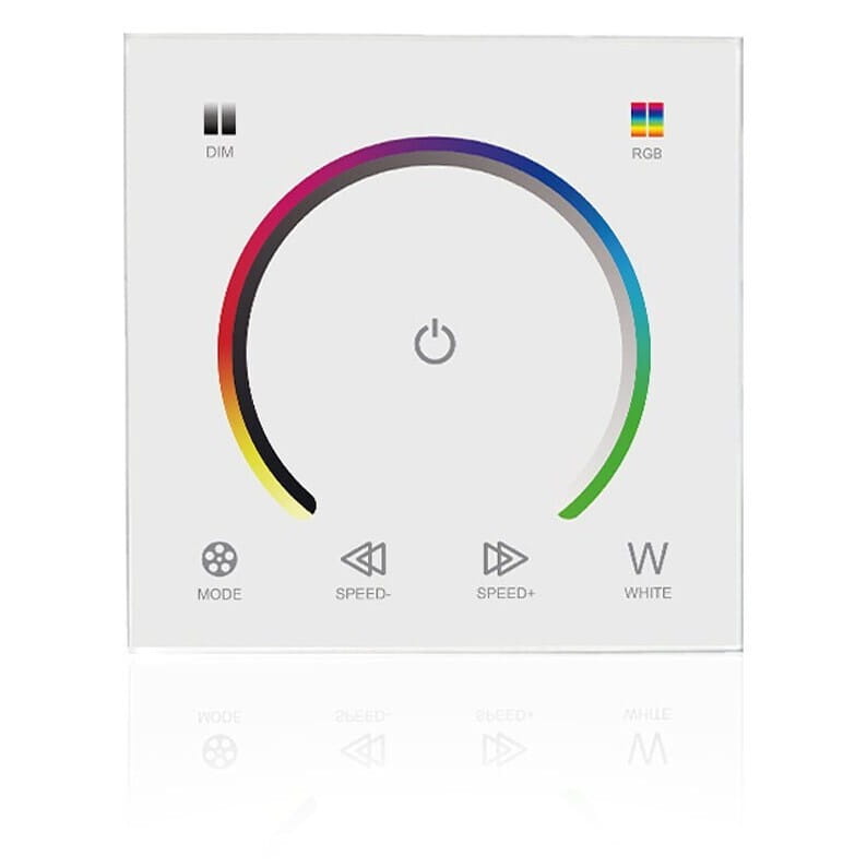 Naścienny manualny sterownik RGB/RGBW z panelem dotykowym umożliwia zmianę kolorów oraz jasności taśmy Led RGBW bądź RGB za pomocą dotykowego pierścienia. Jest to ekskluzywny model pokryty szkłem, wykończony dotykowym panelem, którego precyzja zapewnia łatwą zmianę kolorystyki taśmy oraz jej jasności.